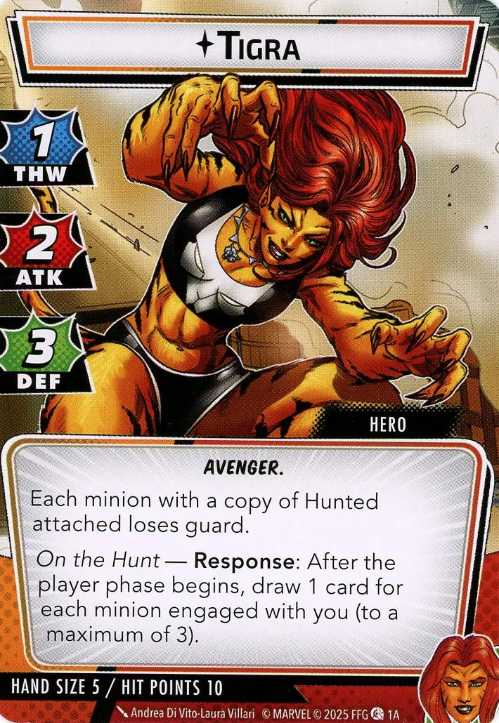 A coherent reprint. Tigra was Spider-Girl’s teacher in Avengers Academy. This choice works thematically and mechanically: status cards have always been linked to Spiders, and targeting only minions evokes well the secondary missions assigned to Academy students – less critical threats than those handled by the Avengers. I also like to think that master and student both interact with minions.