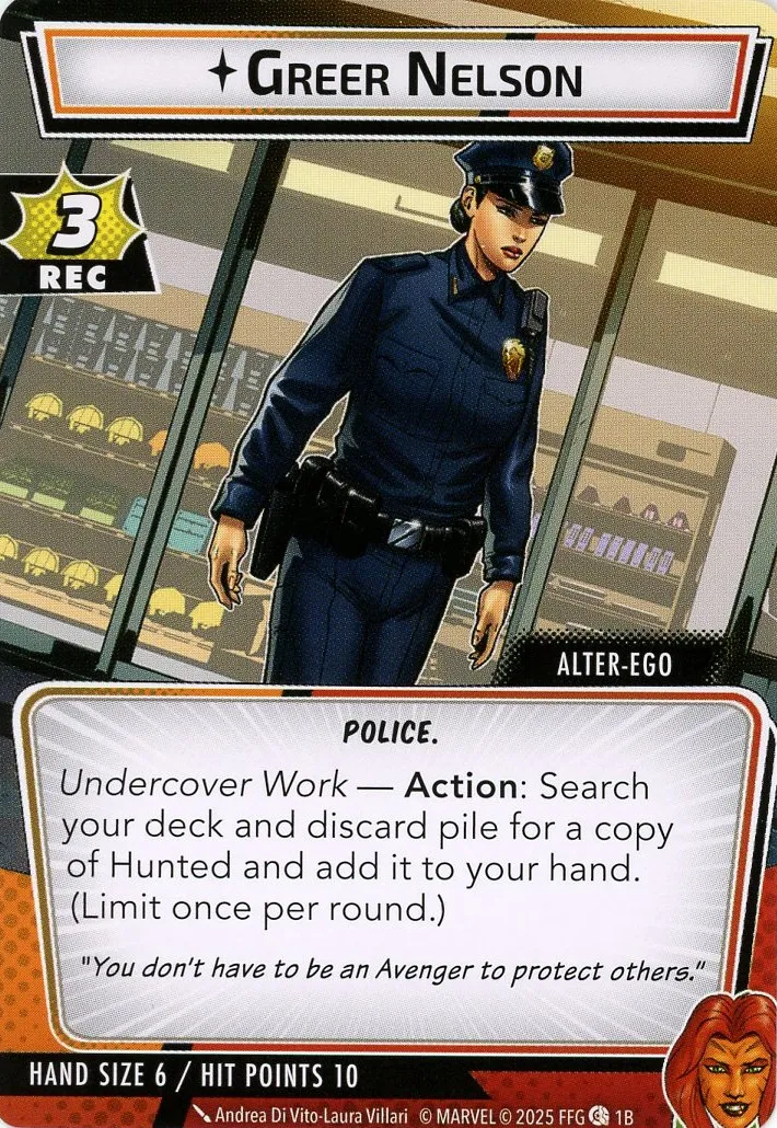 Between 2002 and 2024, she infiltrated three organizations: a corrupt police department in her “Tigra” run, the resistance during Civil War, and also spied on Moon Knight (we’ll come back to that). She excels at tailing, tracking her targets thanks to her animal instincts that she retains even in human form. Hence the “undercover work”. Her stats reflect this human duality: hand size of 6, 10 hit points, REC of 3.