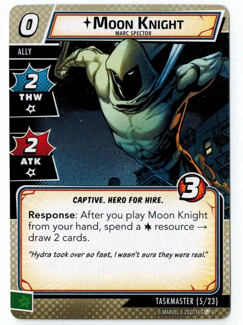 Writers have long played on the cliché of the cat meowing under the moon. But in Moon Knight 2021, their flirtation evolved into a true friendship – a duo that works perfectly. Tigra agrees to spy on Marc Spector for the Avengers, worried about his mental health. This infiltration mission between close friends adds dramatic tension. Moon Knight will discover the betrayal without taking offense, simply admitting he needs a friend. Since then, they form a duo that’s a hit at newsstands, like cat and dog. No other signature ally would have made as much sense for her. He shares the same stats as his previous incarnation in the Red Skull deluxe expansion, but changes his trait to represent a different time period.