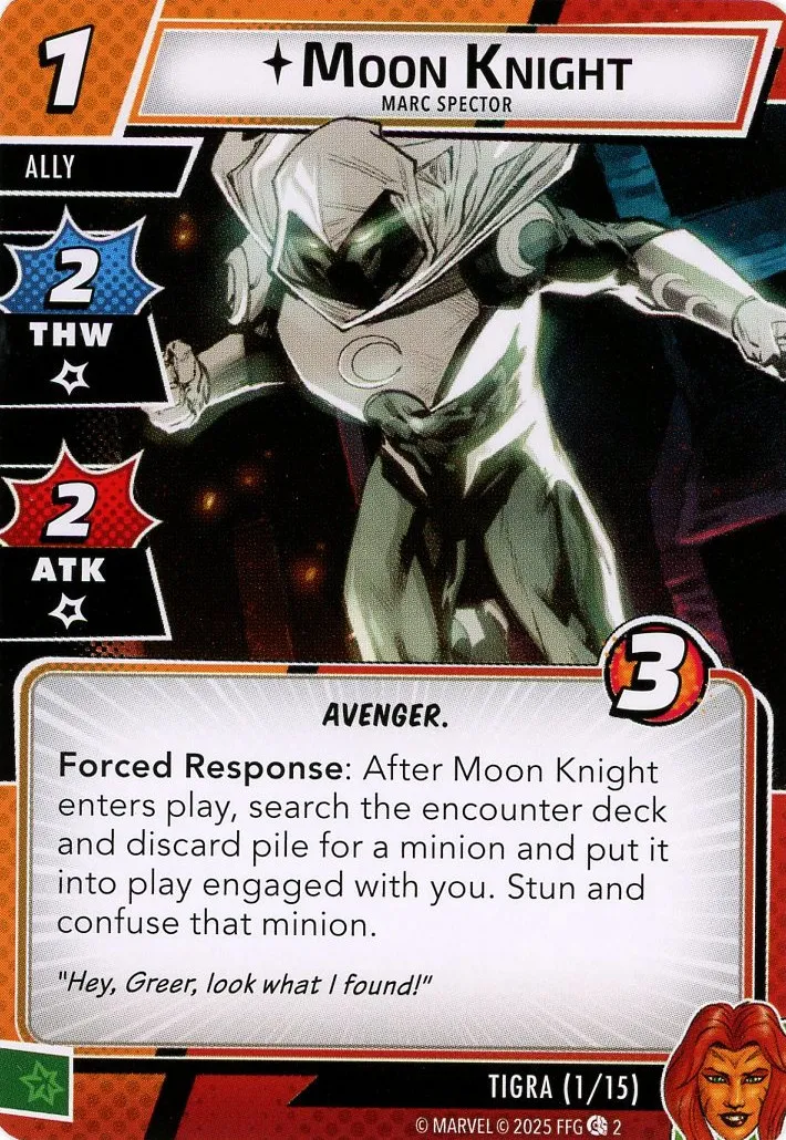 Caleb Grace delivers a design guided by his in-depth reading of Tigra’s lore. Sure, he recycles the Dúnedain mechanic from LOTR LCG, but he manages to create a mechanically successful character because it’s thematically coherent. The picture painted by these cards will excite players. The increased risk via multiple minions, the tactical choices that follow, and this explosive style hit the mark.