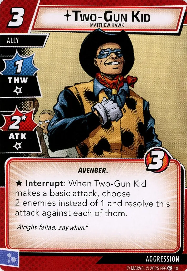 Two-Gun Kid has practically no connection to Tigra. In reality, designer Nate wanted this obscure character in the core set. Caleb replaced him with the more popular Tigra, but promised to reintroduce Two-Gun Kid later – a promise kept with this pack. The card is explicit: two guns, period.